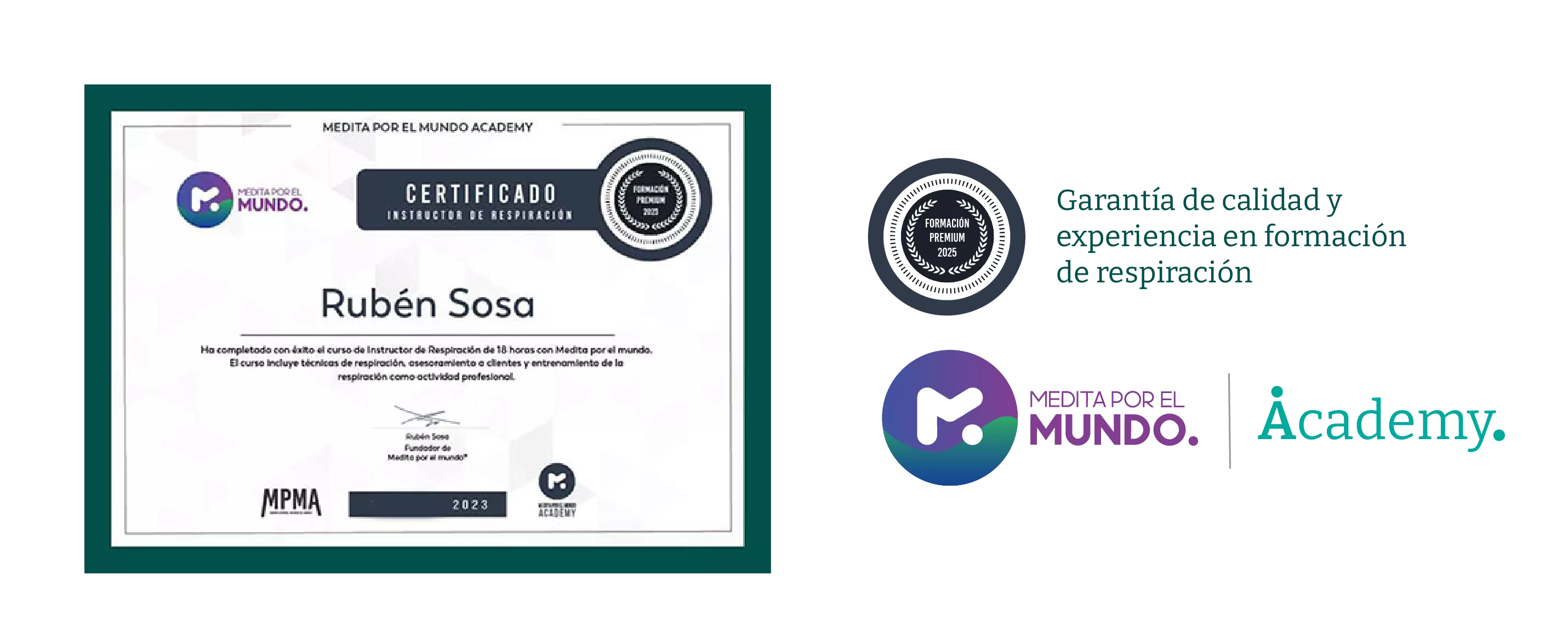 Este curso está acreditado por Medita por el mundo Academy. Los alumnos que lo superen satisfactoriamente, obtendrán un certificado que los habilita para dar clases, talleres particulares y grupales de técnicas de respiración en estudios de yoga, centros de fitness, gimnasios y empresas de todo el mundo.